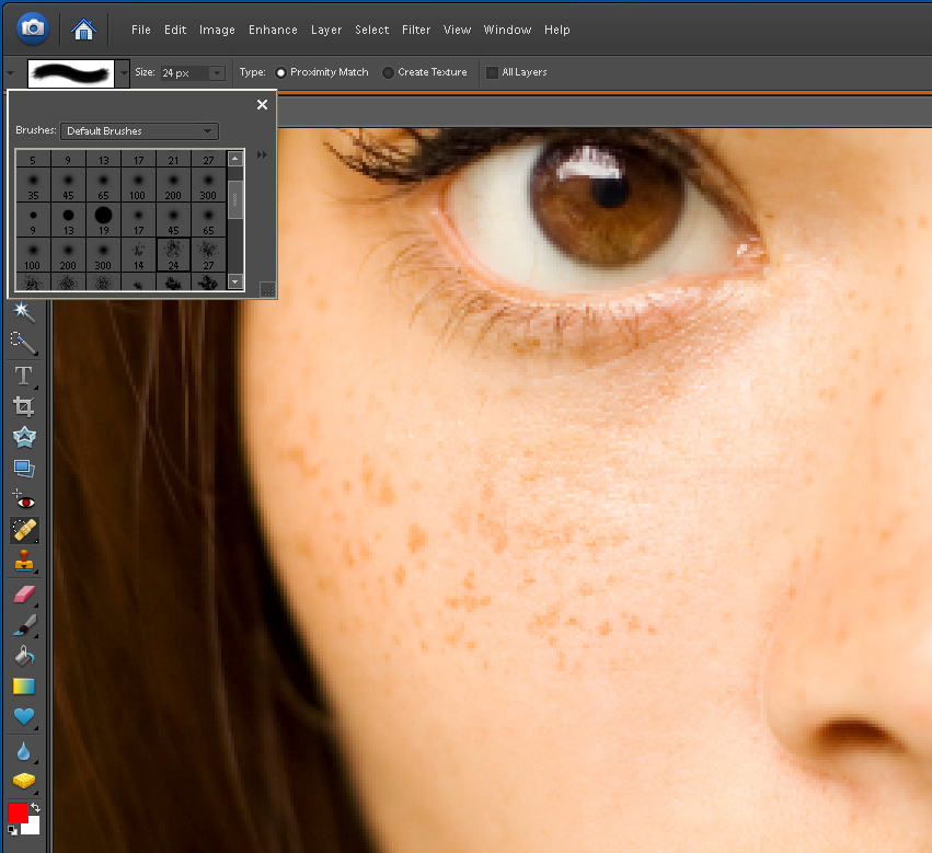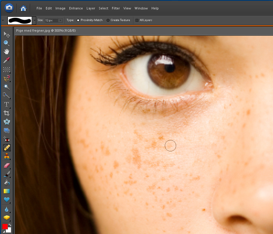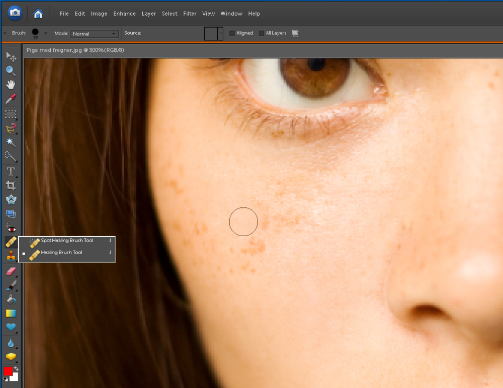 For det meste klarer Spot Healing Brush Tool opgaven fint, men i visse områder kan funktionen vise sig at være problematisk. I det her billede er det især omkring kanten af kinden. Her ændrer baggrunden sig markant, og derfor kan Spot Healing Brush Tool finde på at hente eksempelvis meget mørke nuancer fra baggrunden og smide dem ind på pigens kind. Det ser ikke specielt kønt ud. Finten er at vælge Healing Brush Tool (Genvej: J), der ligger side om side med Spot Healing Brush Tool. I stedet for at Photoshop Elements 6 selv bestemmer, hvorfra den låner hud og farver til at lappe fregnerne, så kan du selv bestemme. Du holder blot ALT-tasten nede så kommer et sigtekorn frem og du finder frem til en jævn overflade. Herefter klikker du på venstre musetast og så er du parat til arbejde med de mere besværlige områder. Klik på billedet for at se det i et større format.