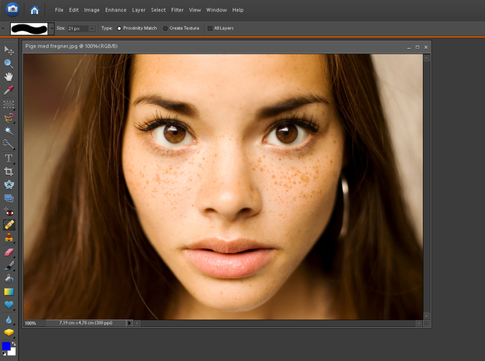 Vi har fundet Photoshop Elements 6 frem og vil på de næste sider vise, hvordan du på fem minutter foretager en let form for digital kirurgi på billedet af den fregnede pige, som du kan se til højre.