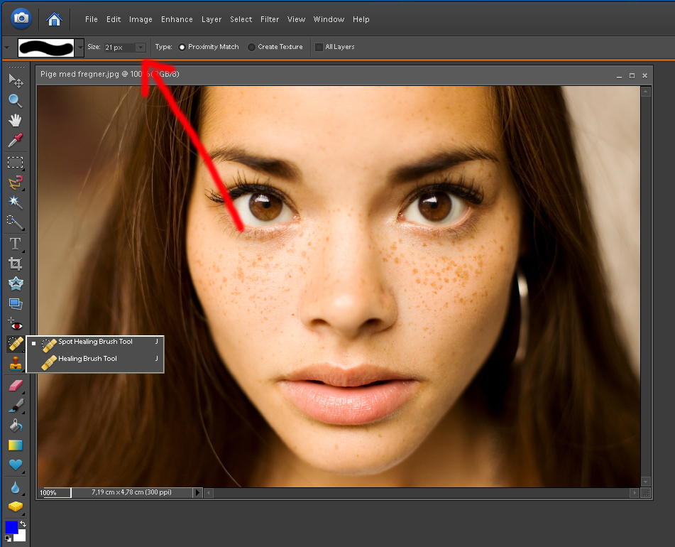 Til at begynde med åbner du det billede, som du vil behandle i Photoshop Elements. Herefter vælger du Spot Healing Brush Tool (Genvej: J). Ikonet forestiller et plaster, og det er præcist den effekt, vi skal bruge: Vi skal nemlig i gang med at lappe. Den røde pil viser hen til størrelsen på plastret. Du vælger en passende størrelse og er klar til at gå i gang. Klik på billedet for at se det i et større format.