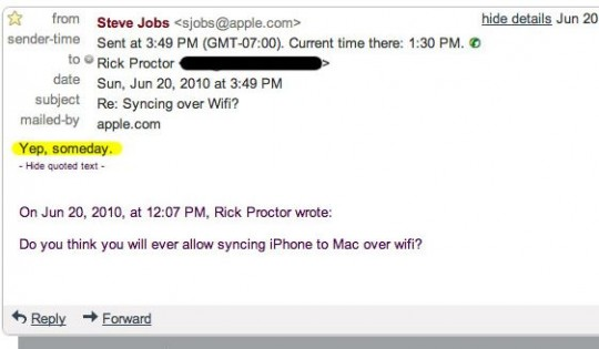 Apples direktør, Steve Jobs, har faktisk allerede afsløret, at det bliver muligt at synkronisere trådløst med iTunes. En bruger skrev fornyelig en mail til Apple-chefen og spurgte om det nogensinde blev muligt. "Jep, en eller anden dag," lød svaret fra Hr. Jobs.