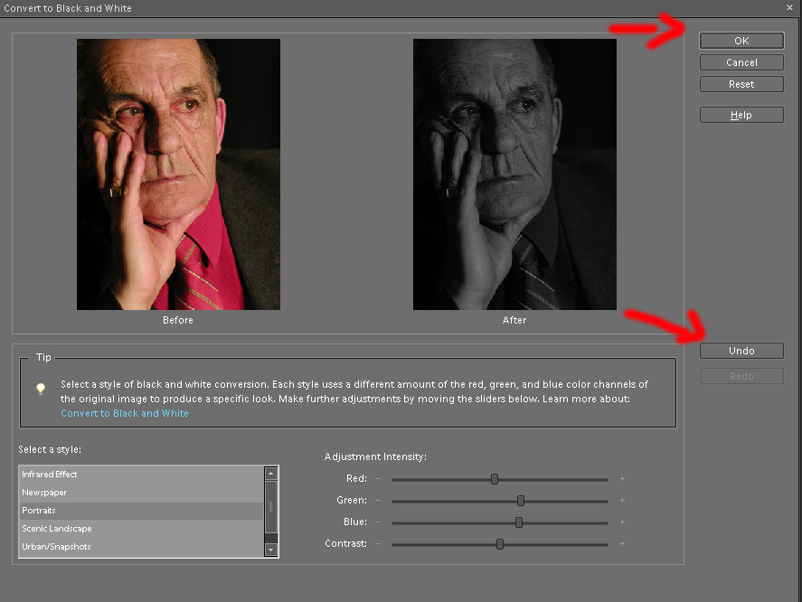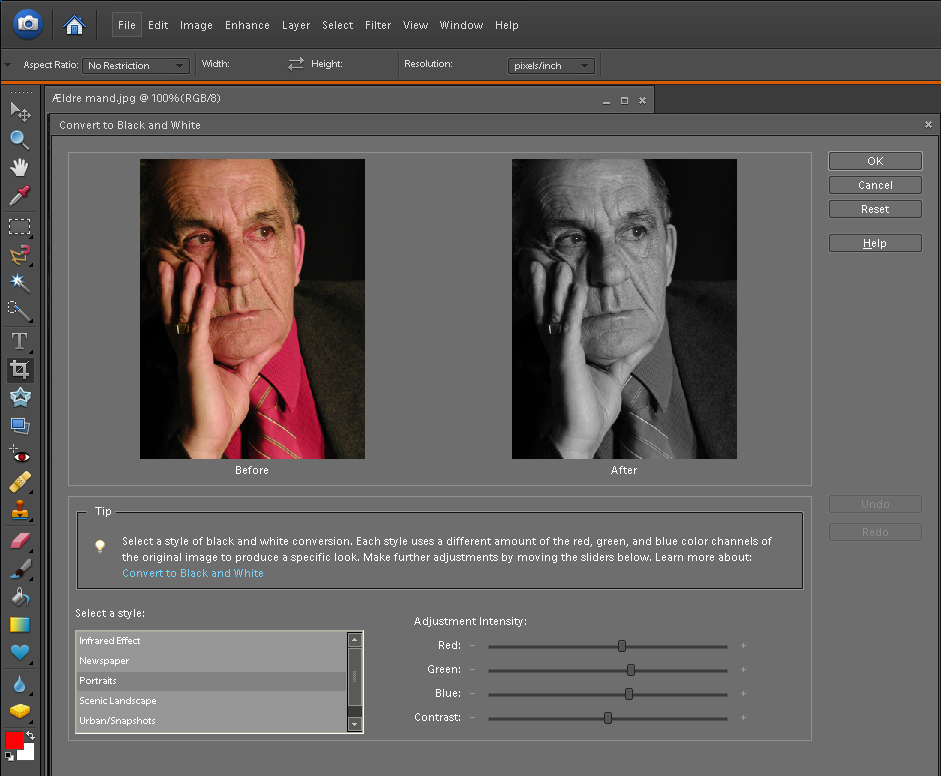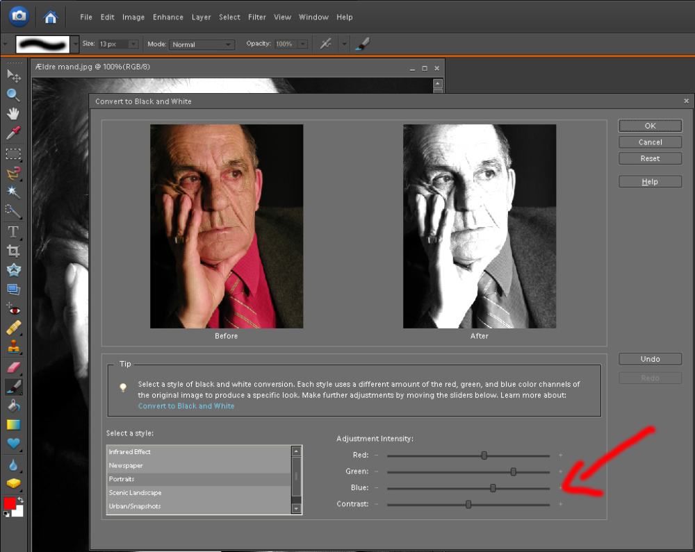 Hvis du ikke er helt tilfreds med de sort/hvide nuancer på dit billede, så kan du finjustere det. I nederste højre hjørne finder du menuen Adjustment Intensity. Her kan du trækker i farverne rød, grøn og blå. Bare rolig, der kommer ikke farve på dit billede, de sørger bare for at hente mere eller fjerne data fra de originale farvekanaler. På den måde kan du gøre billedet mere lyst eller mørkt. Et vigtigt punkt er også kontrasten. Den har du ligeledes mulighed for at justere, og det kan give dine sort/hvide er langt bedre udseende. Klik på billedet for at se det i et større format.