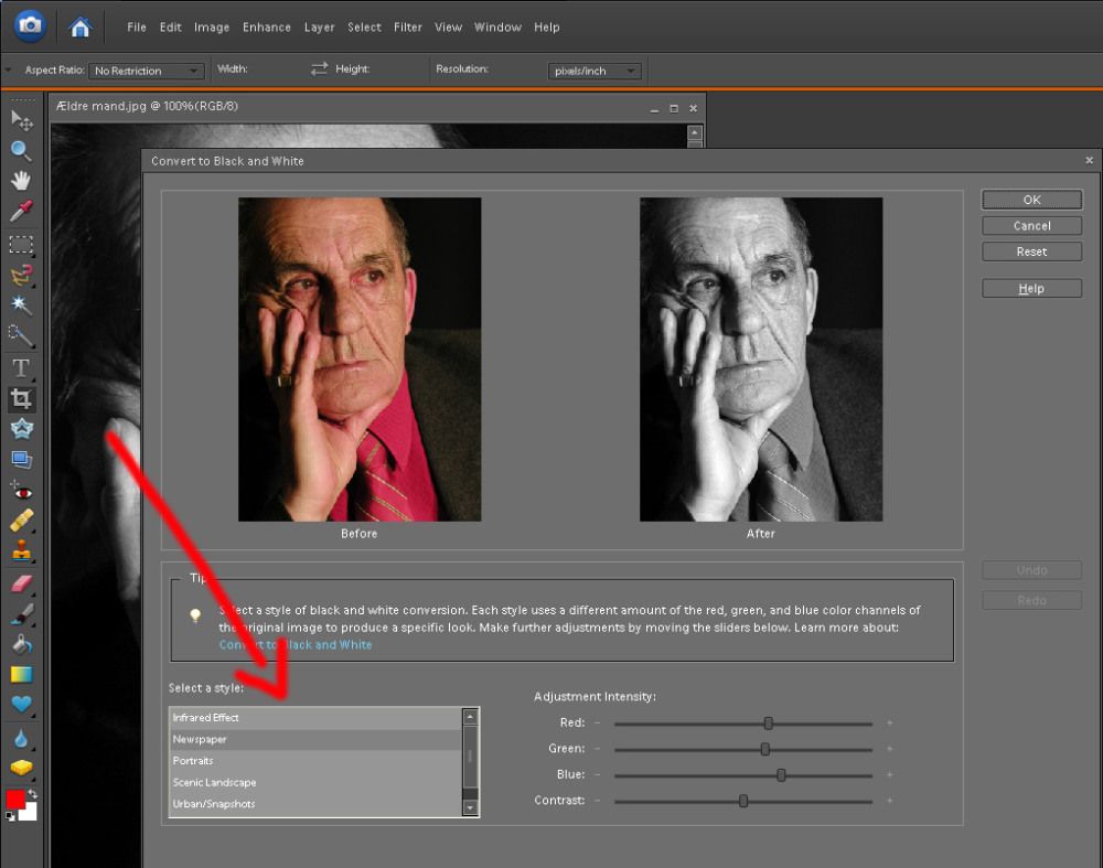 Der er allerede oprettet forskellige stilarter, blandt andet portraits (portræt), newspaper (avis) og landscape (landskab). Hvis du klikker på dem, vil de giver forskellige sort/hvide versioner af billedet. Selv om vi i dette tilfælde har et portræt, skal vi ikke nødvendigvis vælge portrait. Det kan ligeså godt være, at vi hellere vil have en anden sort/hvid fortolkning hen over billedet, eksempelvis Newspaper. Klik på billedet for at se det i et større format.