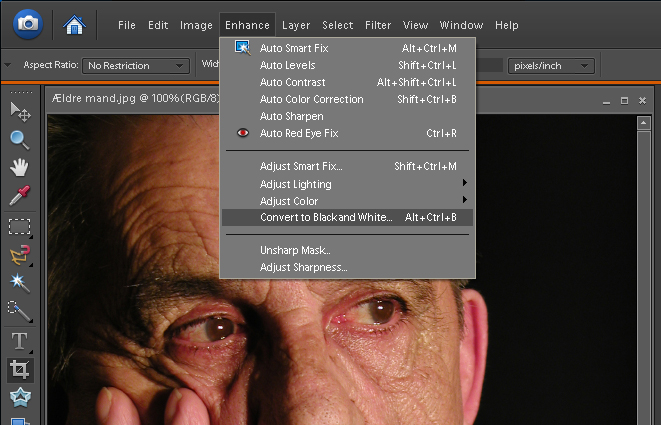 Herefter vælger du menuen: Enhance og derefter Convert to Black and White (Genvej: Alt+Ctrl+b). Klik på billedet for at se det i et større format.