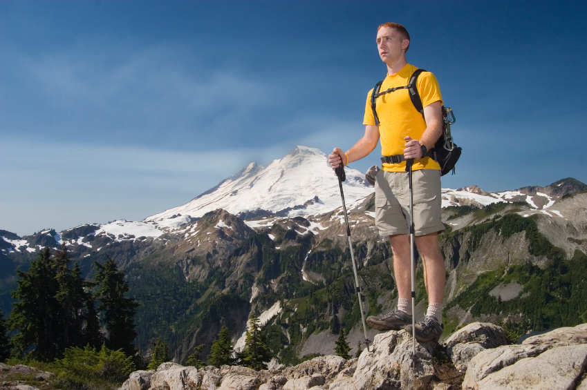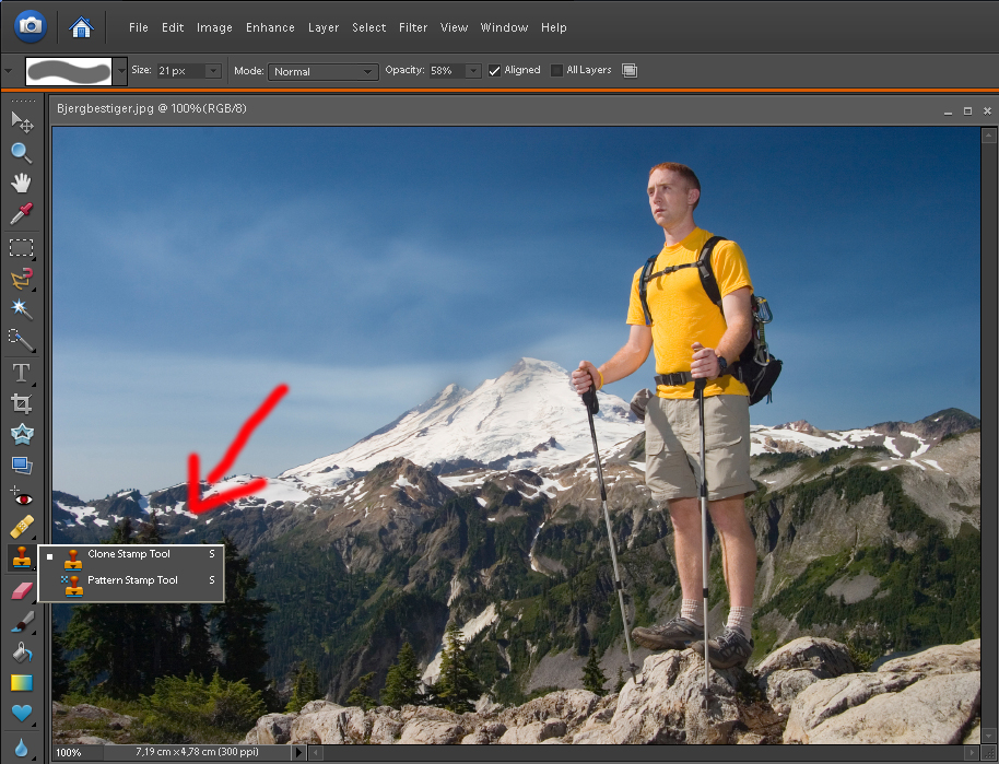 Du åbner dit mislykkede foto op i Photoshop og vælger Clone Stamp Tool (Genvej: S). Værktøjet skal simpelthen bruges til at klone skyer og bjerge ind over manden med vandrestavene, som vi ikke gider have med på billedet. Klik på billedet for at se det i et større format.