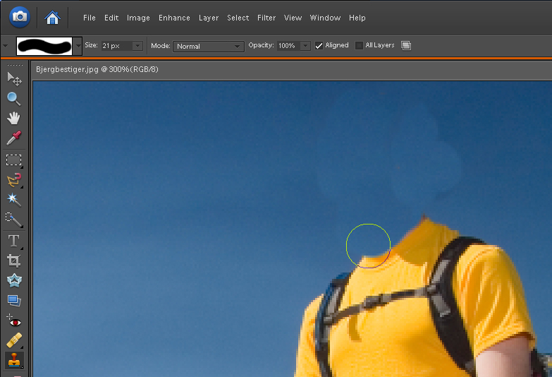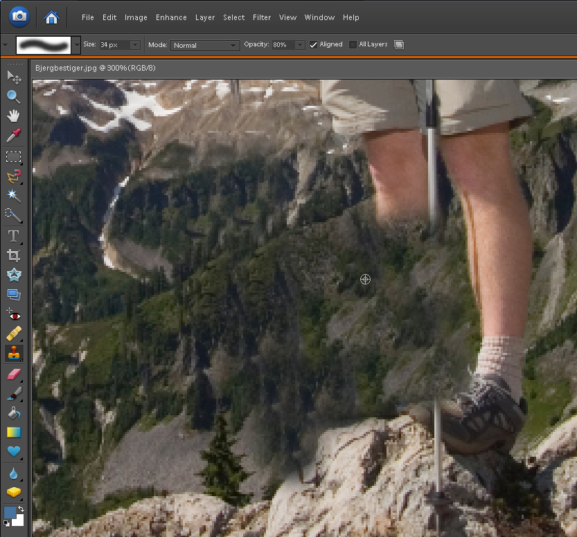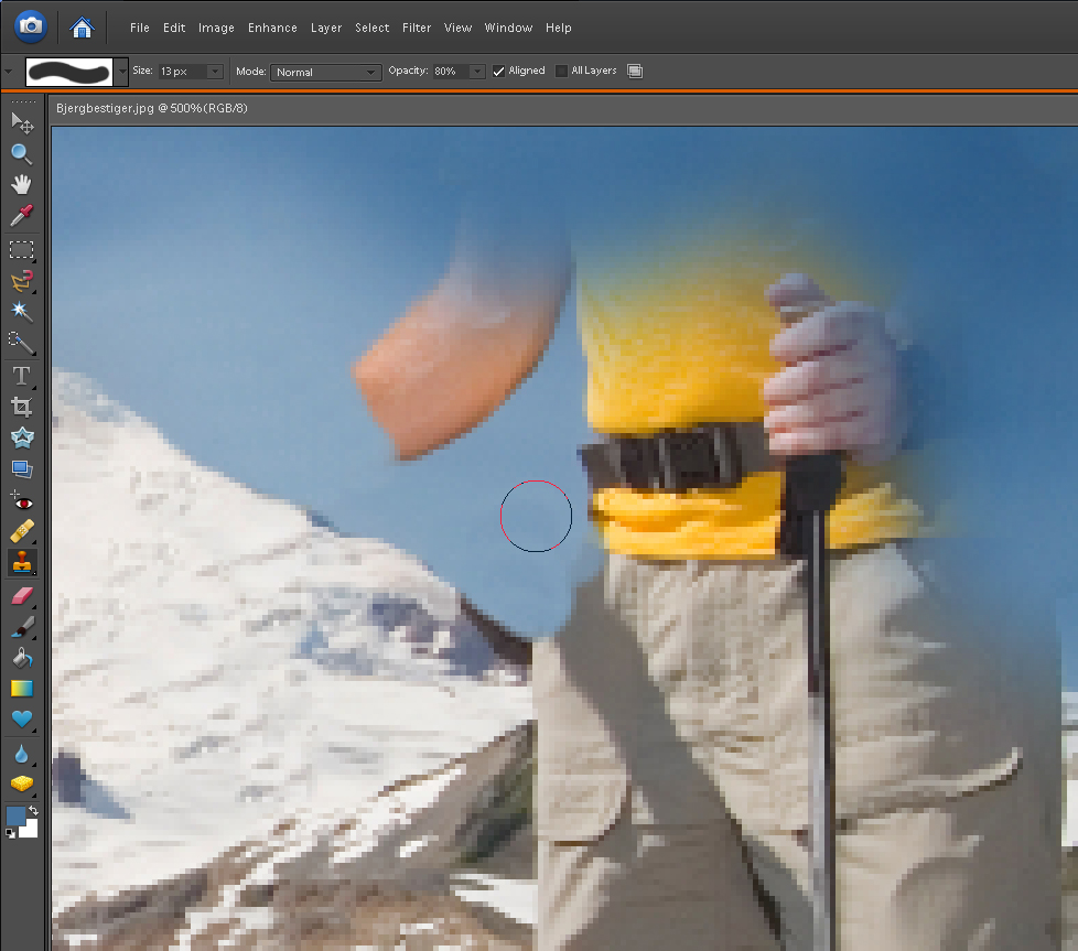 Nu skal du forklare programmet, hvorfra det skal klone. Du holder derfor Alt-tasten nede et sigtekorn kommer til syne - og du lader musen finde frem til et passende punkt og klikker på venstre musetast. Herefter er det bare om at male over bjergbestigeren med små lette klik. Klik på billedet for at se det i et større format.