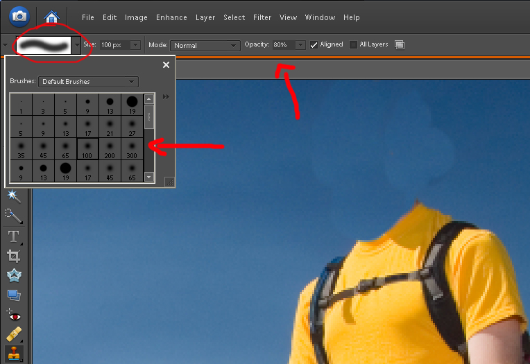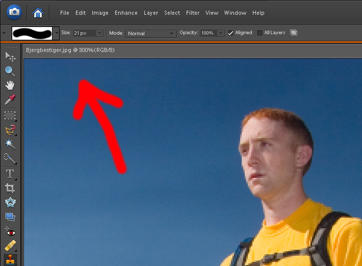 Du vælger en passende størrelse pensel og zoomer ind på dit foto (Genvej: Ctrl +). Du skal nemlig arbejde med detaljerne, og derfor er det bedst at zoome ind omkring 300 procent, så du er sikker på ikke at ramme forkert med penslen. Klik på billedet for at se det i et større format.