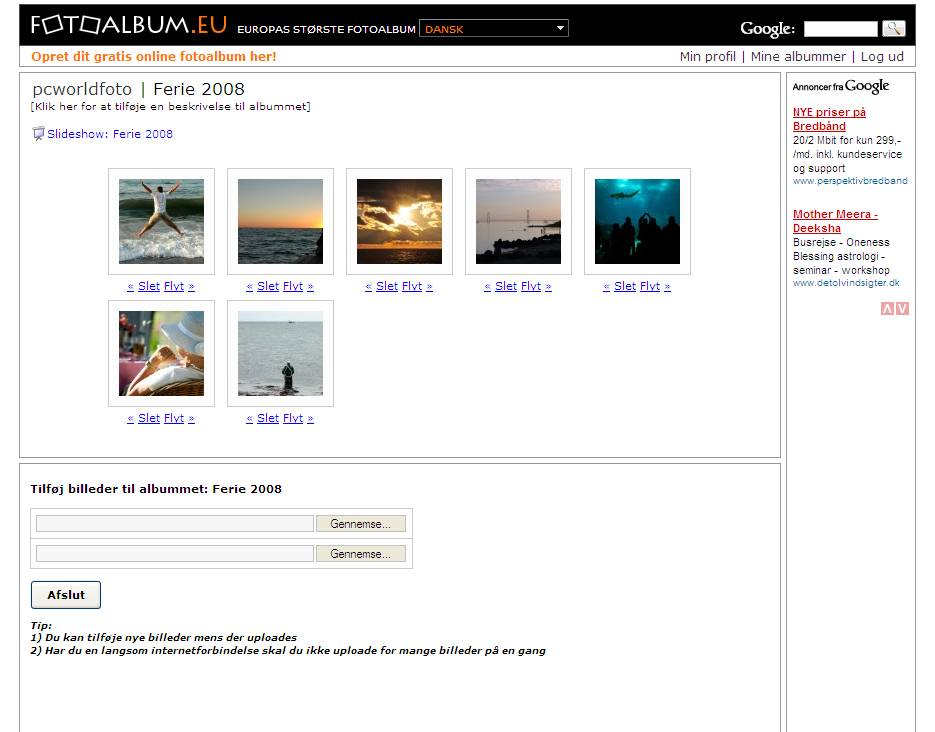 Fotoalbum.eu er dog ikke helt håbløs. Dine billeder kan vises i et slideshow med sort baggrund, og det fungerer udmærket, selv om overgangen mellem billederne kunne være gjort mere flydende og lækker.