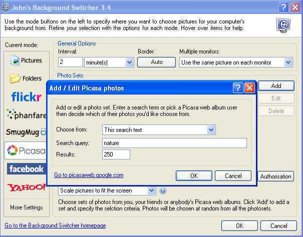 Du vælger selv, hvor ofte baggrundsbilledet skal skifte – fra et minut til flere dage – og som eksempel, så kan du vælge Picasa, vælge antal billeder og vælge et søgeord, den skal hente billeder ud fra.