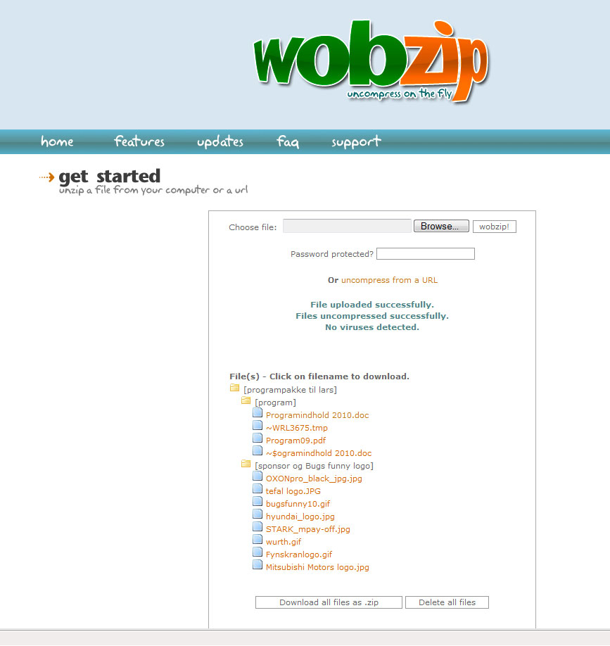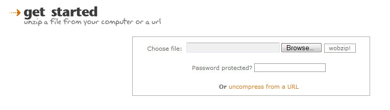 Wobzip.org understøtter filtyperne 7z, ZIP, GZIP, BZIP2, TAR, RAR, CAB, ISO, ARJ, LZHCHM, Z, CPIO, RPM, DEB og NSIS og giver dig desuden mulighed for at indtaste et eventuelt kodeord på arkivet.