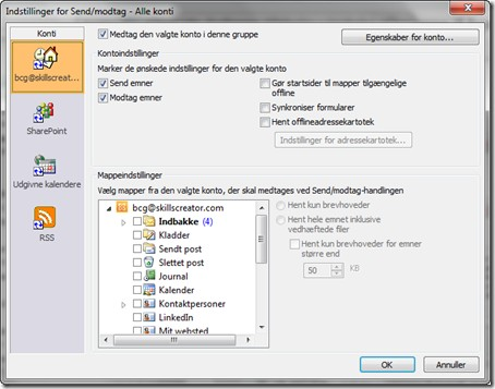 Løsningen på problemet finder du ved at tilpasse den Send/Modtag-gruppe, du anvender i Outlook. En Send/Modtag-gruppe definerer hvilke mailkonti, kalendere og SharePoint-arbejdsområder, Outlook henter informationer fra samt hvilke RSS-kilder, der hentes nyheder fra.