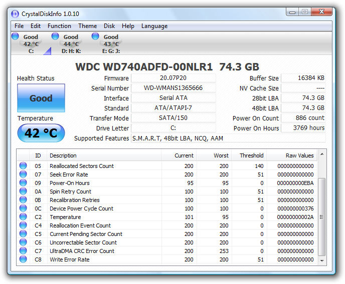 Hvis du kører Crystal Disk Info, får du en oversigt med al den information, den kan give dig, samt den overordnede status.