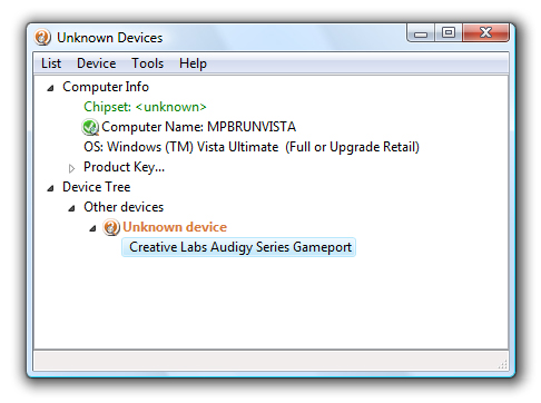 Som eksempel blev der på billedet til højre fundet en ukendt enhed, men Unknown Devices kunne genkende den som Creative Labs Audigy Series Gameport.