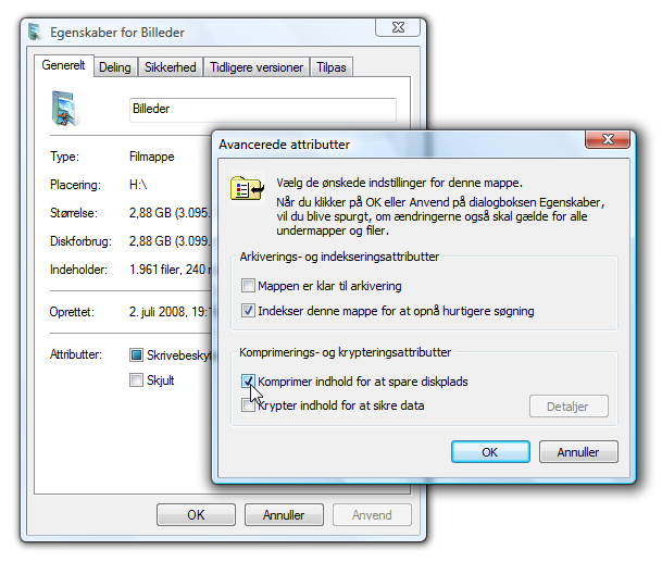 Ved komprimering, som fungerer i både XP og Vista, er der dog nogle ting, som du skal være opmærksom på, inden du går i gang med at komprimere dine filer, mapper eller hele drev.
