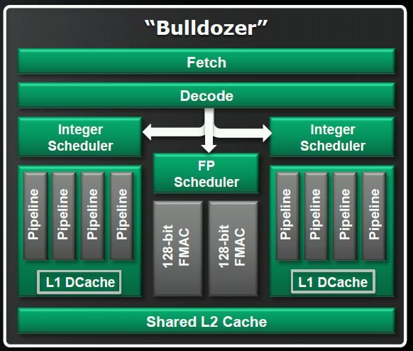 Modsat Atom-konkurrenten Bobcat er Bulldozer møntet på stationære, arbejdsstationer og servere. Under AMD's HotChips-konference blev det afdækket, at denne arkitektur vil spænde over processorer med to og helt op til otte kerner - altså fra dualcore og helt op til octocore. Med AMD's alternativ til Hyper-Threading betyder det, at en processor med otte kerner kan afvikle helt op til 16 simultane tråde.