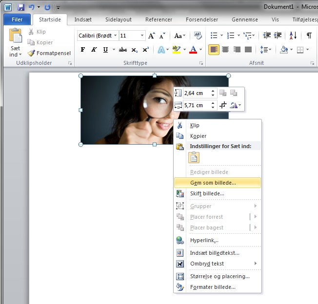 Højreklik på billedet og vælg 'Gem som billede' i genvejsmenuen. Så kan du gemme billedet i PNG, JPG eller et andet billedformat direkte fra Word. Klik for større billede.