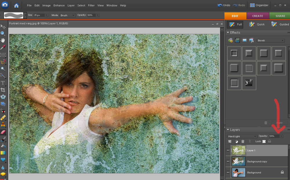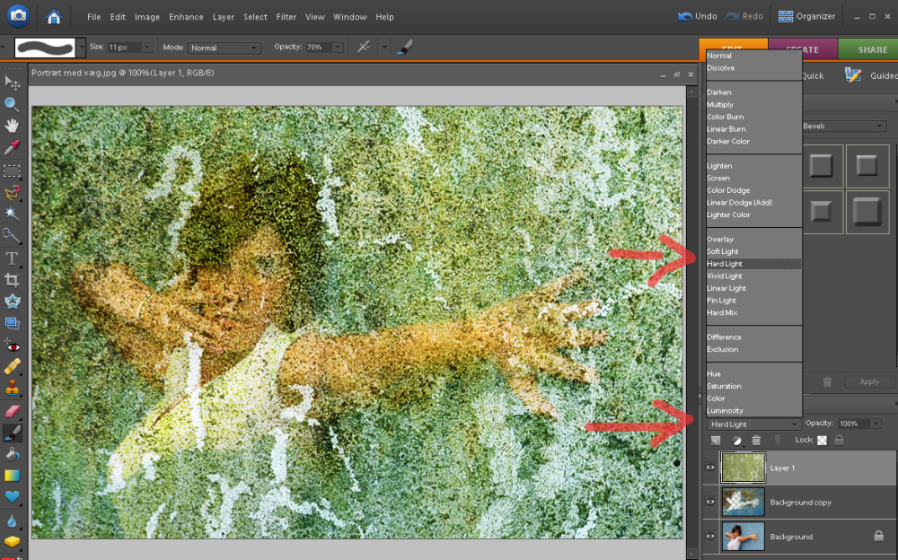 Vi kan vælge blot at skrue ned for opacity igen, men før vi gør det, kan vi også vælge at klikke i normal og vælge hard light, soft light, vivid light eller en helt fjerde. Det vil tilføje en effekt til laget, eksempelvis gøre det lysere eller mere farverigt. Vi vælger hard light til dette foto, men i princippet er der frit valg og plads til at eksperimentere. Klik på billedet for at se det i et større format.