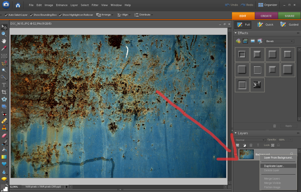 Nu gælder det om at lægge de downloadede textures ind. Vi begynder med at åbne denne væg med rustpletter. Herefter skal vi have flyttet det over til vores hovedmotiv, og der findes flere metoder til at gøre det. Vi kan eksempelvis vælge trykke CTRL+A. Det markerer alt, altså hele billedet. Så trykker vi CTRL+C. Det kopierer det hele. Så gælder det bare om at lukke billedet med væggen og rustpletterne ned og aktivere billedet med kvinden. Så trykker vi CTRL+V. Herefter lægger billedet sig ovenpå. Vi kan også vælge en lidt anderledes fremgangsmåde: Højreklik på Layer nede i højre hjørne. Vælg Duplicate Layer. Klik på billedet for at se det i et større format.