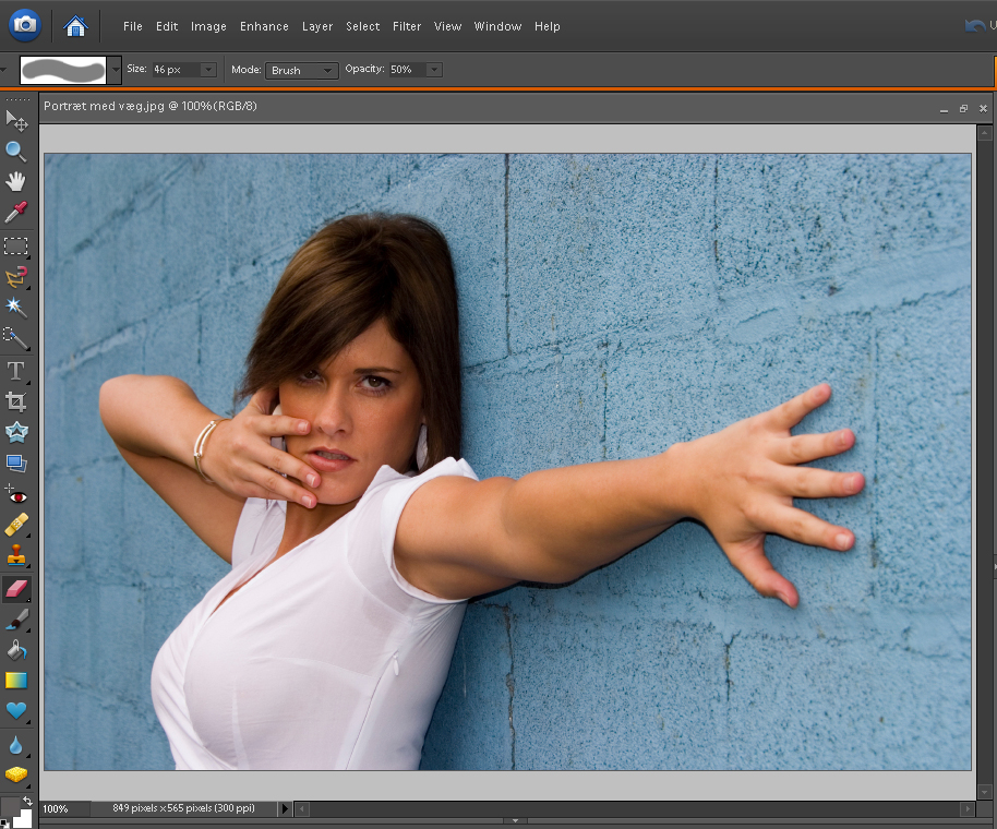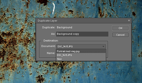 En boks dukker op, og nu vælger vi at kopiere billedet over til vores original med kvinden op ad væggen, portræt_med_væg.jpg. Herefter skal der blot klikkes ok. Herefter vælger vi at lukke billedet af væggen med rustpletter. Klik på billedet for at se det i et større format.