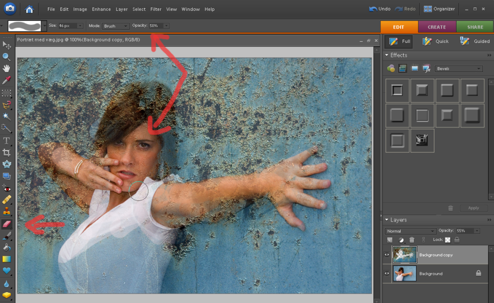 Det er muligt at se kvinden gennem det gennemsigtige lag, men vi vil gerne have hende til at træde mere frem. Derfor vælger vi viskelæderet (Eraser Tool, genvej; E). Vi sørger for at sætte opacity ned på viskelæderet øverst oppe. Se pil. Dermed fjerner viskelæderet ikke hele laget, men sletter kun lidt, og det giver en bedre overgang mellem de to lag. Klik på billedet for at se det i et større format.
