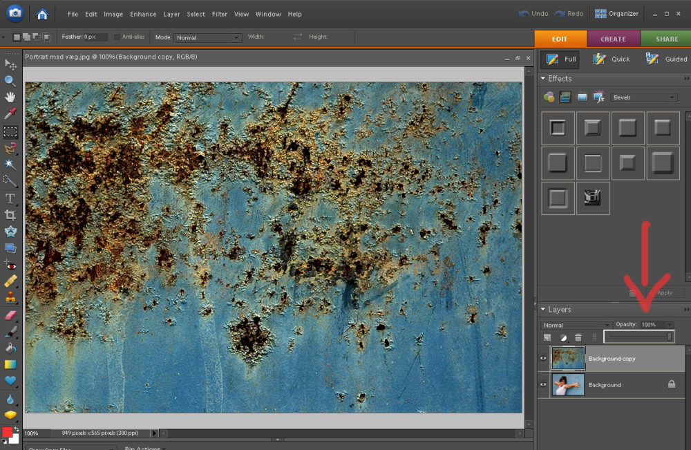 Nu ser vores billede sådan her ud. Bemærk at vi nu har to lag oven på hinanden. Rustpletterne ligger øverst. Vi vælger nu Opacity. Den står på 100 procent. Vi trækker skyderen mod venstre og gør dermed laget en smule gennemsigtigt. I det her tilfælde skruer vi ned til 55 procent. Klik på billedet for at se det i et større format.