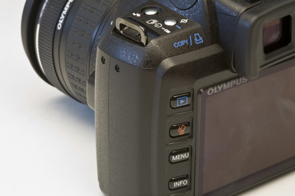 Da der i FourThirds-systemet anvendes en mindre billedsensor end den traditionelle APS-C (brændviddeforlængelsesfaktoren er 2,0 gange), og afstanden mellem objektivets bagerste linseelement og billedsensoren er mindre, er det blevet muligt at bygge forholdsvis små kamerahuse - og meget mindre og lettere objektiver. Alligevel er der blevet plads til en LCD-skærm på 2,7 tommer, og CompactFlash som flashkort til billedlagring.