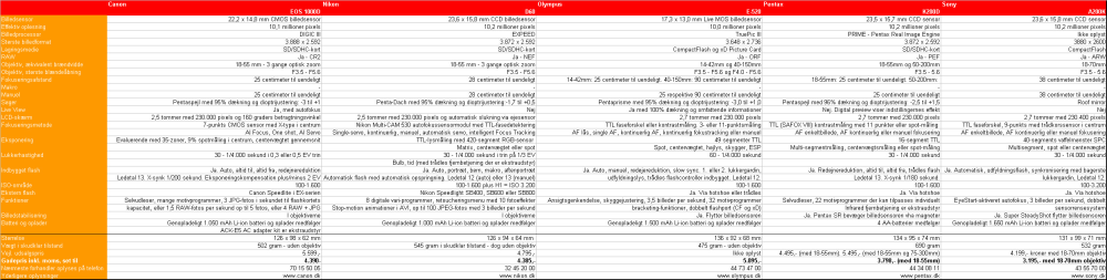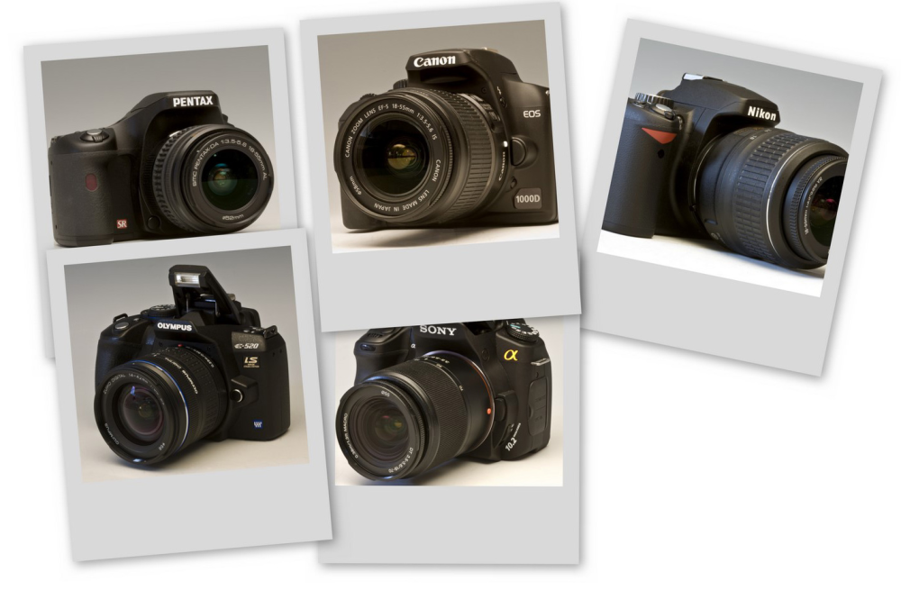 Vi har udvalgt fem testdeltagere: Canon EOS 1000D, Nikon D60, Olympus E-520, Pentax K200D samt Sony Alpha 200, som i kit-versionen med objektiv hedder Alpha 200K.