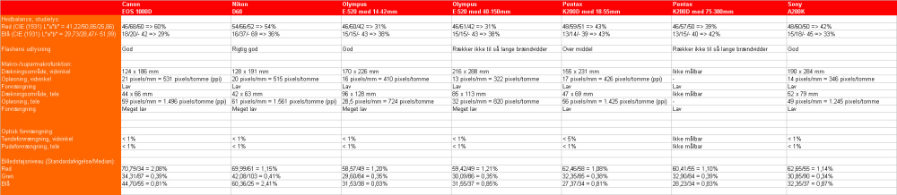 Det tester vi ved hjælp af det føromtalte GretagMacbeth target og kontrolleret studielys - med digitalkameraerne indstillet til automatisk hvidbalance. Ved efterfølgende at udmåle den rene røde og blå farve kan det fastslås, hvor præcist kameraets hvidbalance fungerer.