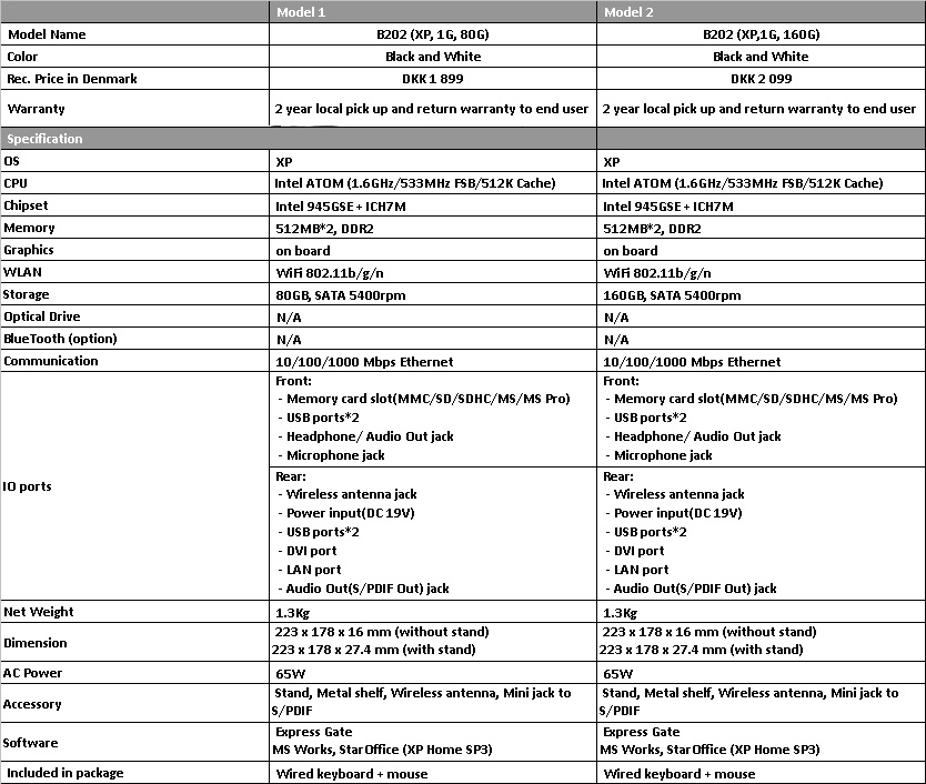 Inden i har vores model, som kommer i handlen til 2.199 kroner, en Intel Atom 1,6 gigahertz processor, 2 x 512 mb ram samt en harddisk på 160 giagbyte.