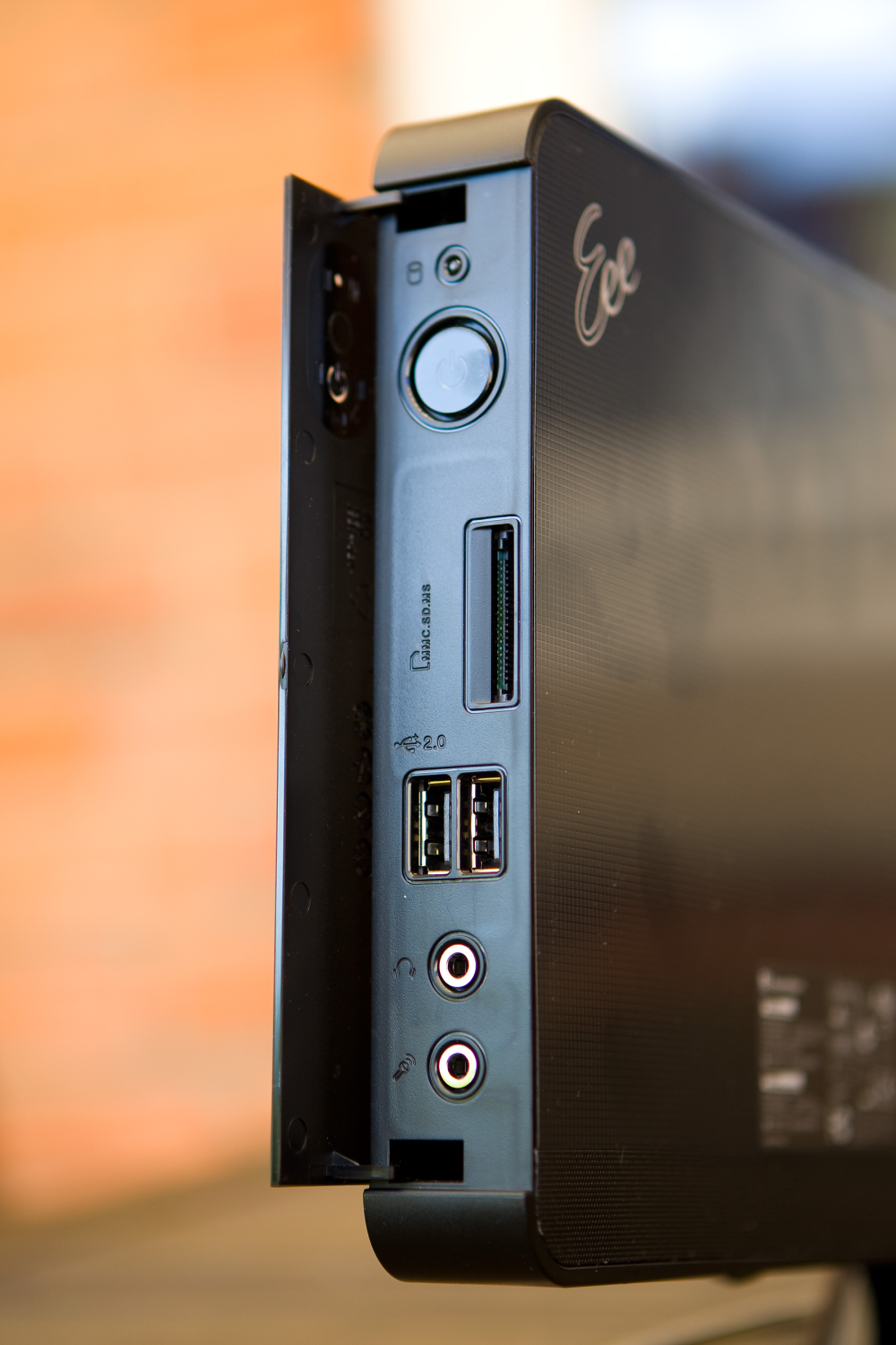 Den lille størrelse gør, at det er begrænset med plads til stik men Asus har fundet plads til det nødvendige. På Eee Boxen finder du således plads til et DVI-stik til monitoren/tv'et, lydudgang og mikrofon-stik på fronten (og bagsiden), fire gange USB-porte (to front, to bag) samt en SD-kortlæser. Strømforsyningen er uden for kabinettet, men fylder heller ikke alverden.
