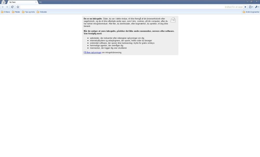 Chrome har også en spændende funktion som Inkognito (det der også kaldes 'porno-mode'…), hvor du kan åbne et nyt faneblad, der ikke gemmer historik, cookies eller andre spor af det, du har surfet. En lignende funktion er den nyeste betaversion af Internet Explorer 8 også udstyret med, her kaldes den inPrivate.