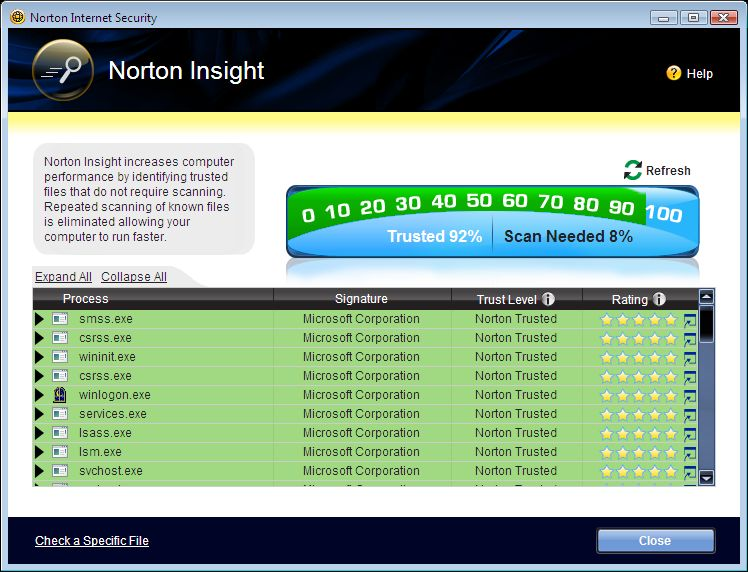 Hemmeligheden bag de hurtige, effektive scanninger af brugerens harddisk er en teknologi, som Symantec kalder 'Norton Insight'.