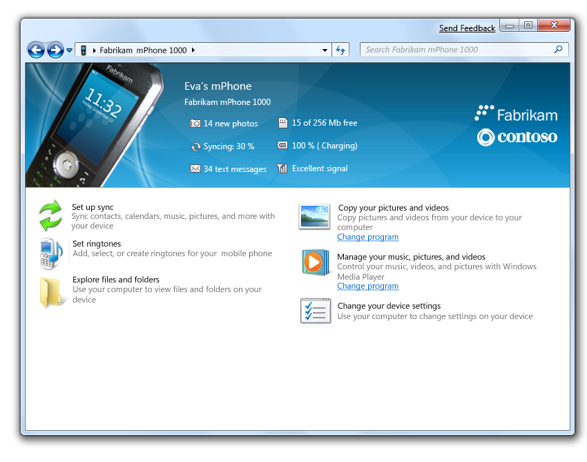 Ifølge Microsoft kommer vi til at se et bedre samspil mellem eksterne enheder og Windows. Det sker med Device Stage, der giver en flottere præsentation af den forbundne enhed i stedet for et fladt ikon af eksempelvis en printer. Samtidig får Device Stage enheder til at opføre sig som applikationer, og der vises, hvilke funktioner en given enhed kan udføre. Device Stage er især smart til synkronisering af mobil og computer og til at overføre mobilfotos. Klik på billedet for at se det i et større format.