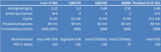 Til testen af Core i7 har Intel lånt os topmodellen 965 Extreme. Den kommer sandsynligvis ikke i handlen lige med det samme, men da den har samme strømforbrug som Intels forgående topmodeller giver den os mulighed for at se, hvilken udviklingen der er sket de seneste år. Og hvordan du kan forvente, at en Core i7 klarer sig over for forgængeren Core 2 Duo ved samme strømforbrug og hastighed i gigahertz.