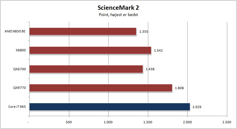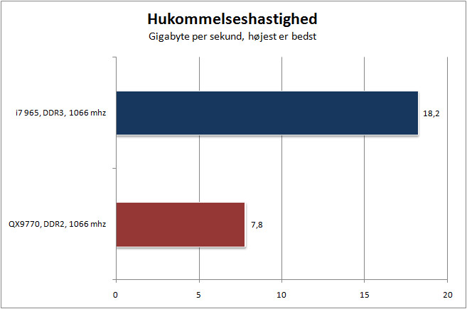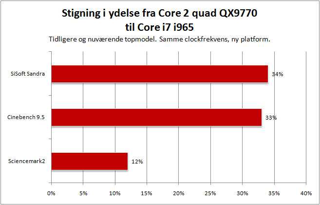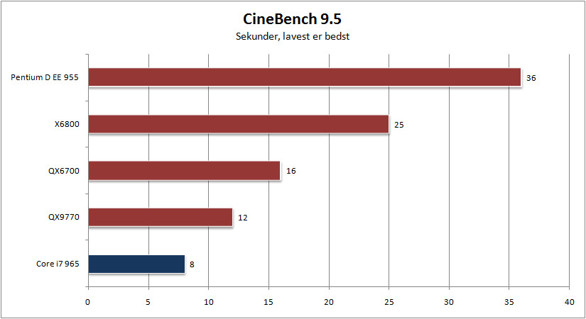 Her er Core i7 Extreme 965 hele 4,5 gange hurtigere end Pentium D 955, dobbelt så hurtig som QX6700 processoren og en tredjedel hurtigere end forgængeren QX9770. Alt imens strømforbruget er holdt på samme niveau.