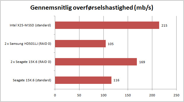 En del læsere har i øvrigt allerede spurgt efter flere benchmarks fra maskinen. Dem kommer vi med i en opfølgende artikel hvor vi sammenligner med en mere almindelig pc - og samtidig kan vi godt love en endnu højere hastighed. For mens den indbyggede harddisk-controller på Asus-motherboardet er udmærket, så er vi sikre på en dedikeret controller vil kunne få endnu mere ud af vores vilde Seagate-diske.
