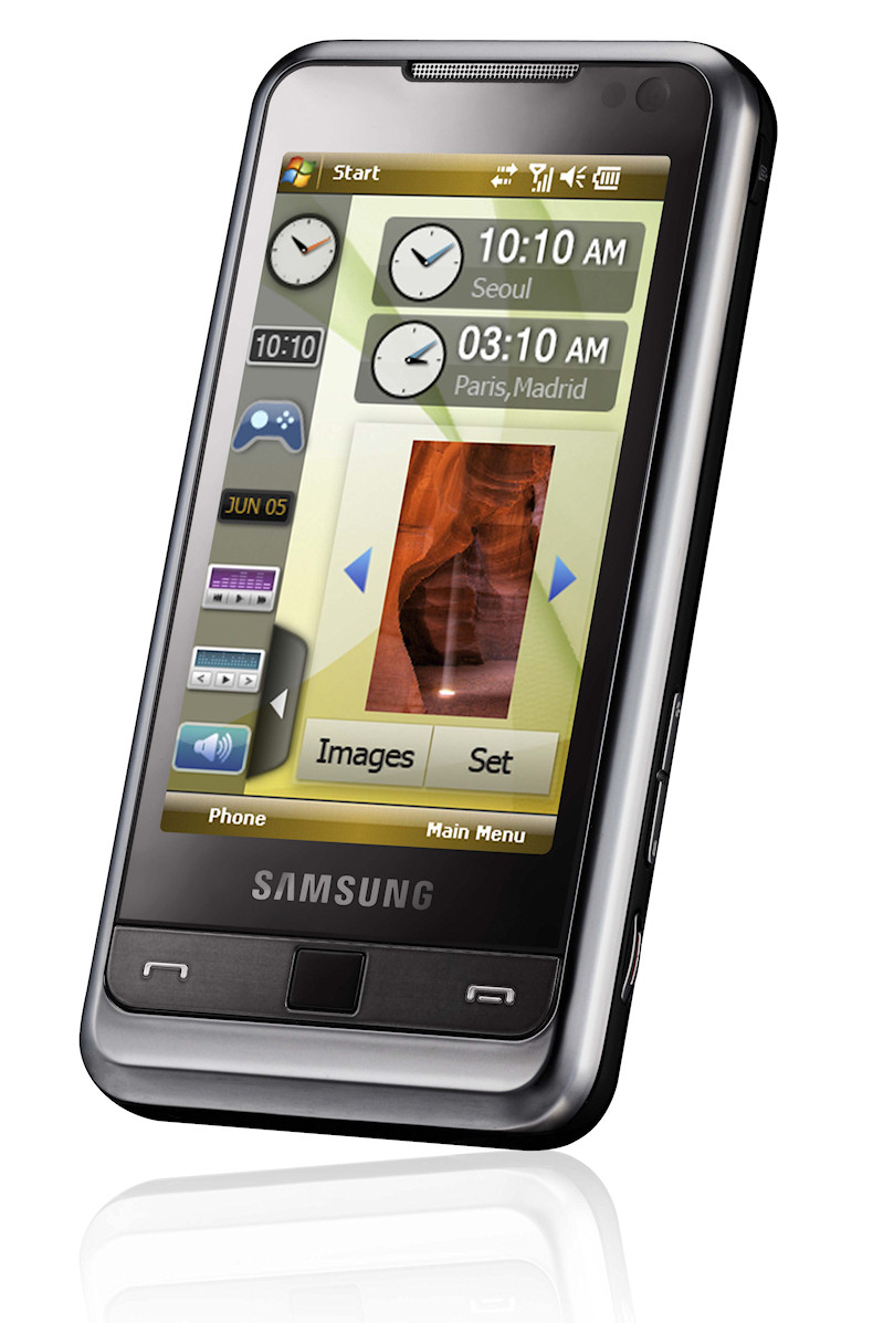 Første indtryk ved Samsung Omnia er bestemt positivt. Linjerne er så rene, at man næsten forventer at finde et æble på bagsiden. Den store trykfølsomme skærm indrammes af en blank metalramme. Og selv om den sorte bagklap er af plast, ligner den metal.