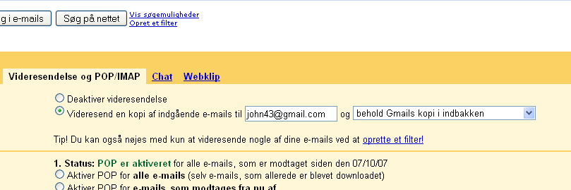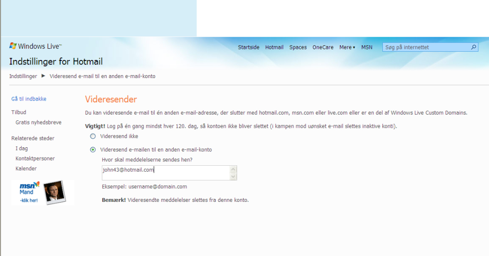 Bemærk, at alle videresendte mail bliver slettet fra mailkontoen, og at du skal logge ind på den gamle konto minimum hver 120. dag, ellers bliver kontoen slettet.