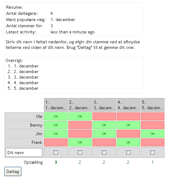 Det er så muligt at følge med i afstemningen løbende. På den måde får man nemt et overblik over, hvilken dato alle (eller de fleste) kan.
