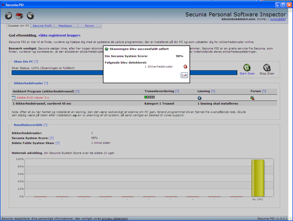 I stedet for at du selv skal tjekke om dine programmer er up-to-date, skanner Secunia din pc og giver dig mulighed for at hente eventuelle sikkerhedsopdateringer.