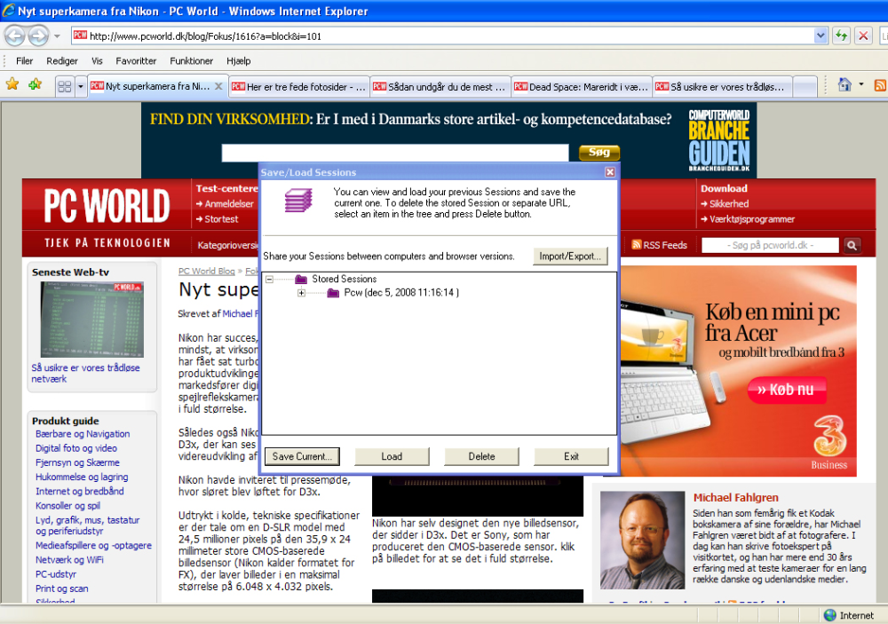 Når du har installeret udvidelsen, kan du via Funktioner-menuen i Explorer gemme den aktuelle session eller hente en, du tidligere har gemt.
