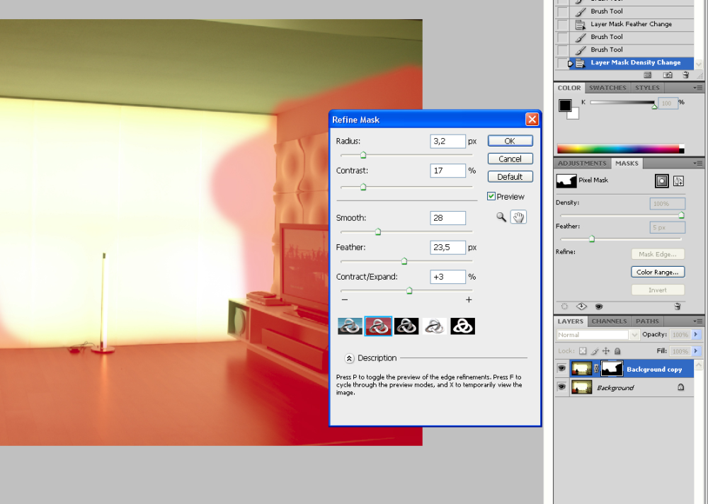 Med vinduet er det lettere at holde styr på maskerne og redigere i dem. Samtidig har du muligheden for at klikke på Mask Edge og gå i gang med fintune din maske. Der er flere muligheder for at få det visualiseret på skærmen, eksempelvis med forskellige farver.