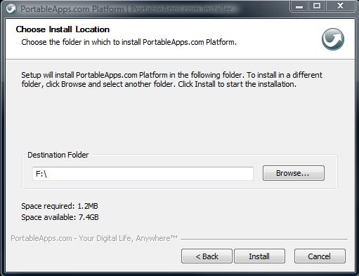 2) Åben Portable Apps. Du får nu et installationsvindue op. Start med at trykke på Next. Programmet spørger nu, hvor du vil installere det. Tryk på Browse og vælg din USB-nøgle, i vores tilfælde drev F (se screenshot til højre). Tryk derefter på Install. Når den er færdig med at installere menuen, vil den spørge dig, om du har lyst til at starte den med det samme. Der er sat kryds i boksen fra starten, så bare tryk Finish. Du vil nu se et ikon, som ligner en lille pil på proceslinjen. Hvis du klikker på pilen, vil du kunne se en tom menu.