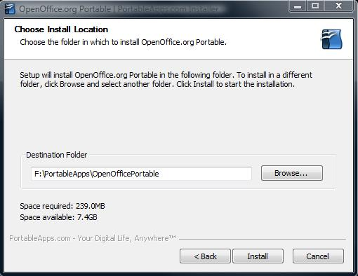 3) Nu er det tid til at installere selve OpenOffice. Start med at downloade det her. Åben det. Du får et nyt installationsvindue op. Tryk Next. Programmet spørger, hvor du vil installere det og burde selv have fyldt en korrekt sti. Hvis ikke, skal du trykke på Browse og finde frem til mappen PortableApps under din USB-nøgle, i vores tilfælde kom der til at stå F:\PortableApps\OpenOfficePortable (se screenshot til højre)