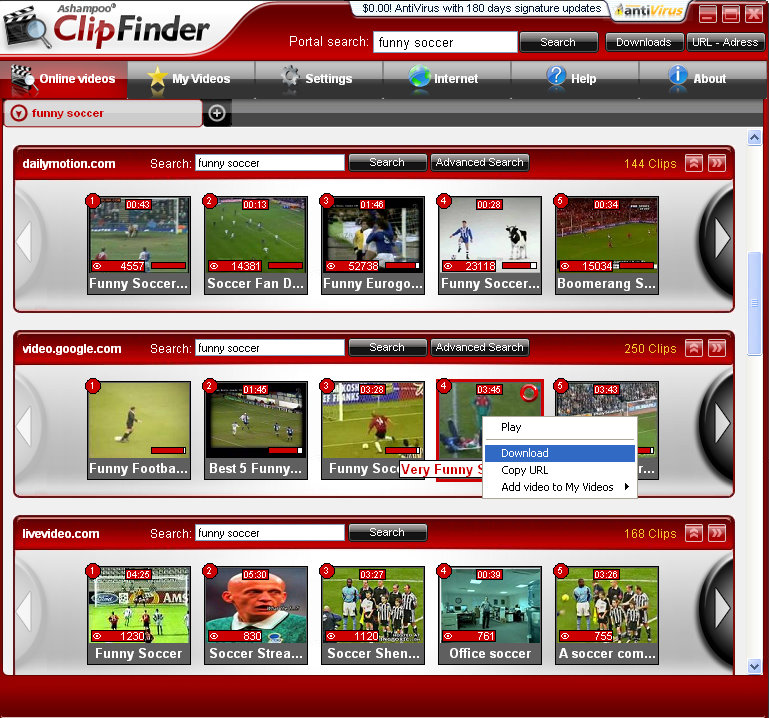 Du kan naturligvis afspille videoklip direkte i Ashampoo ClipFinder, så du ikke behøver at gå ind på respektive videosider.