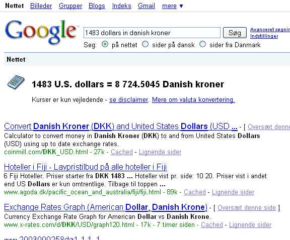 Skal du hurtigt vide, hvad 10 dollars er i euro, kan du skrive ' 10 dollars in euro' og trykke 'enter', så får du svaret. Du kan også skrive '10 dollars in danish kroner', og så får du et mere hjemligt resultat.