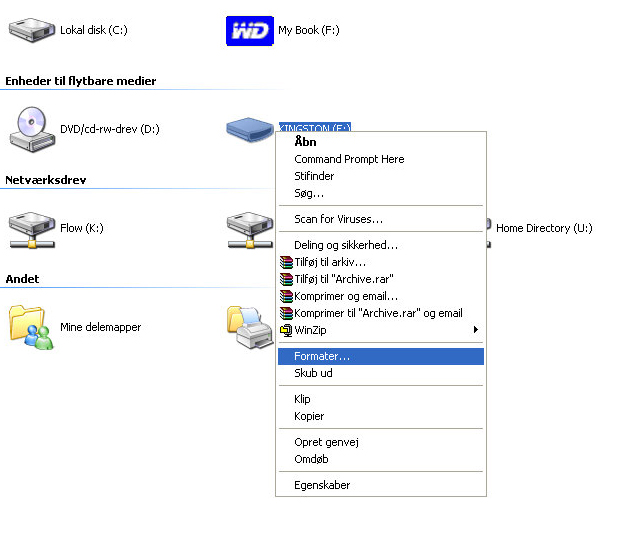 Gå i Denne Computer og højreklik på din USB-nøgle. Klik på punktet Formater.