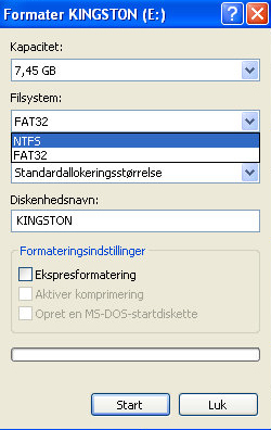 Start med at tage en sikkerhedskopi af det materiale, som du allerede har på USB-nøglen (eller USB-harddisken). Under normale forhold kan du godt ændre filsystemet fra FAT32 til NTFS, uden der slettes filer, men tag nu backup for en sikkerheds skyld. Der er ikke noget værre end filer, der forsvinder.