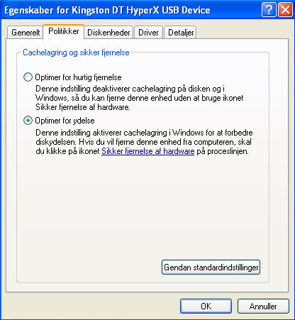Højreklik og vælg Egenskaber - efterfulgt af fanebladet Politikker. Nu vælger du Optimer for ydelse og klik ok.