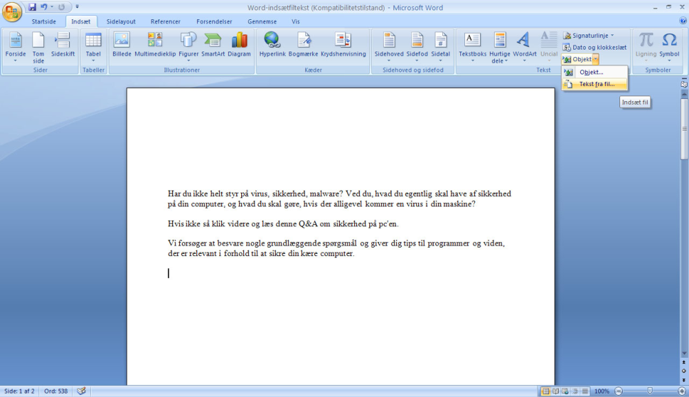 Til sidst klikker du på 'Indsæt', og så er al teksten fra filen indsat i dit aktuelle dokument.