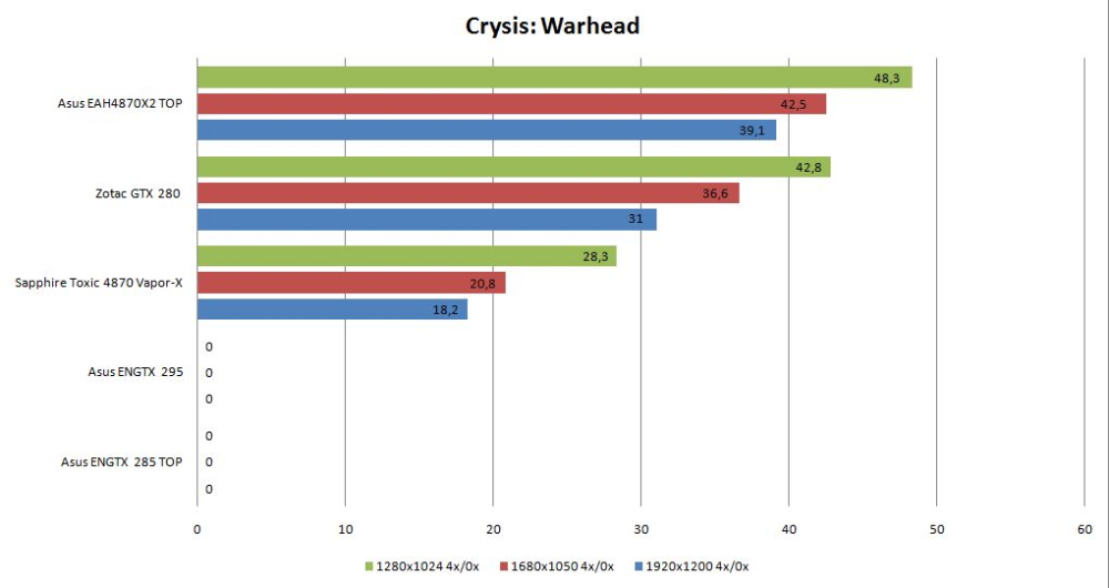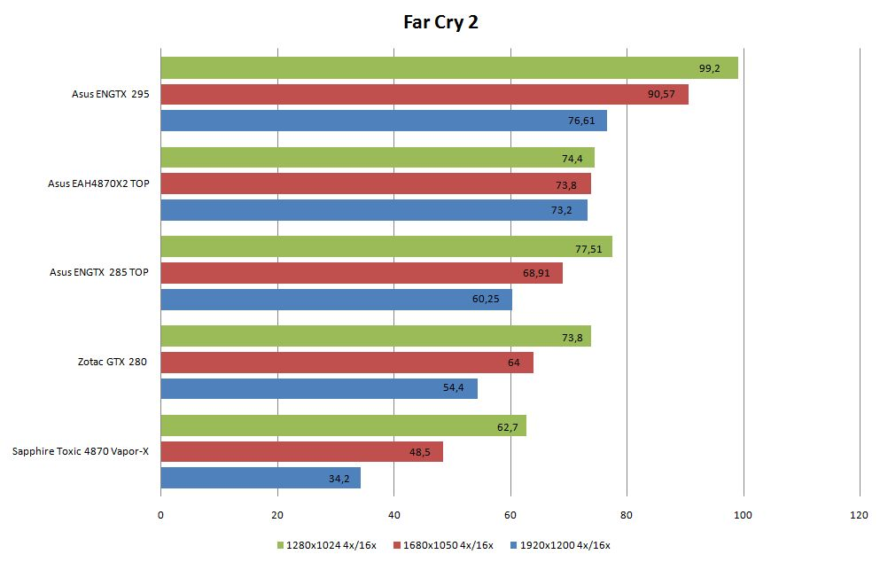 Oversat til reel spilydelse er det ikke et stort udslag på fps-barometret, og GTX 280 følger for det meste pænt med, men Asus har givet hastigheden yderligere et nøk i vejret, så det præsterer 670 megahertz på kernen og 1.300 megahertz på kortets ram.